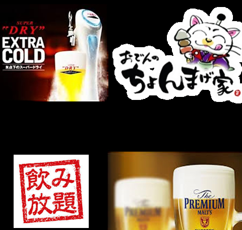 ちょんまげ家は居酒屋では珍しい2メーカーの生ビールをご用意!『アサヒ氷点下エクストラコールド』『サントリープレミアムモルツ』が楽しめます!もちろん飲み放題も!