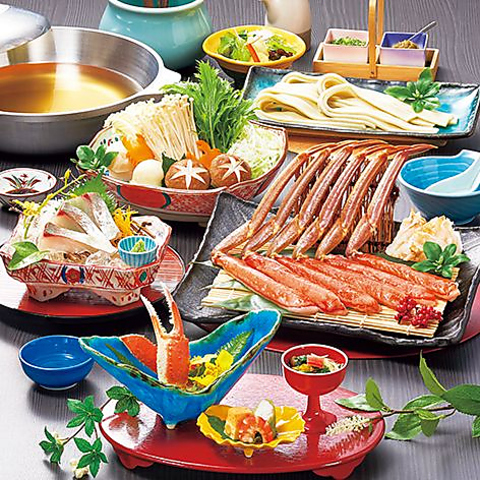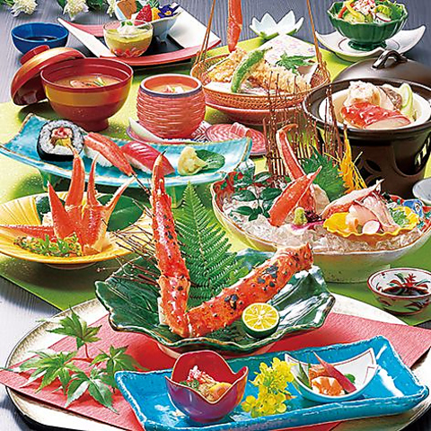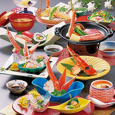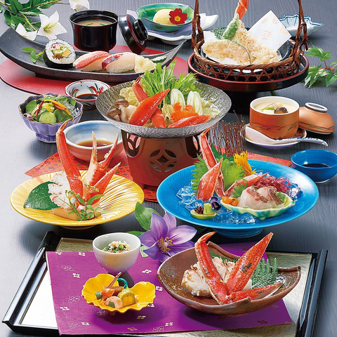 ●茹でがに●小鉢二種●かにサラダ●かに刺身●かにすき一人鍋●ずわい焼き●かに天ぷら●寿司●お椀●デザート 腕によりをかけた逸品ぞろいのフルコース。大切な日のお食事にも大変好評です。※詳細はコースページをご確認ください。