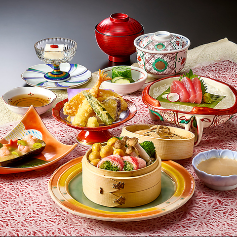 お造り、牛肉ときのこのせいろ蒸し、西京クリーム味噌の茄子田楽、揚物、御飯、汁物、香の物、デザート/【茶碗蒸し付きに変更できます】1980円(税込)/※銀座五丁目店はご用意がございません。※写真は木曽1760円(税込)のイメージです。