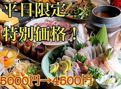 平日限定で各種宴会コースがさらにお得♪通常5000円(税込)宴会コースが→4500円(税込)!通常4500円(税込)宴会コースが→4200円(税込)に!