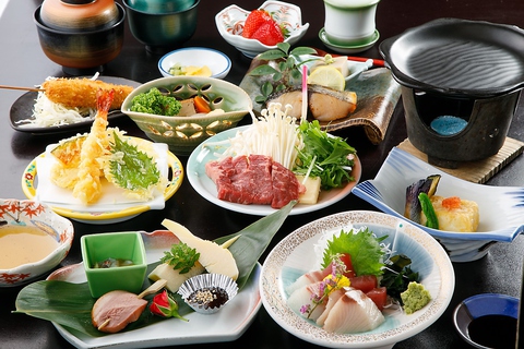 口取り 炊き合わせ 牛の陶板焼き 刺身盛合せ 焼き魚 天ぷら 串カツ揚げ出し豆腐 茶碗蒸し