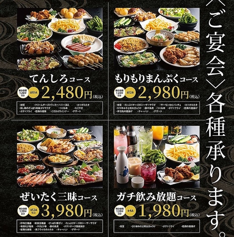 2名~70名まで!!宴会・忘新年会、追いコン、打ち上げ、卒コン、サークル飲み会、コンパなどなど大小各種宴会なんでもおまかせください!! 選べる5種の宴会コースで内容、価格とも自信をもってご提供させて頂きます。 名物炭火串焼をはじめ、居酒屋の定番からこだわりの逸品までメニュー豊富に取り揃えております。