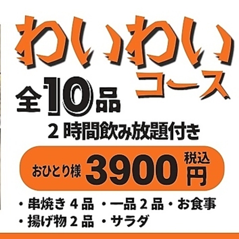 《120分飲み放題付》2名様~OK!全10品『わいわいコース』3900円(税込3900円)★2名様からOKになりました!飲み放題120分と人気メニューを10品楽しめます。飲み放題はラストオーダーも120分。