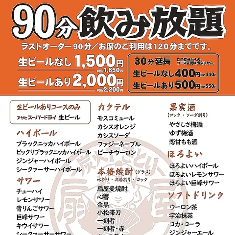2名様~OK!コースは3900円(税込)・4500円(税込)・5500円(税込)と3種類!前日までの要予約ですが、扇屋の料理がリーズナブルに堪能でき、飲み放題はお酒好きも大満足の品揃え◎サワーカクテルなども豊富にご用意しております!会社宴会や仲間同士の飲み会など、皆様でお楽しみ下さい♪(※飲み放題の延長は30分ごと1人500円で可能)