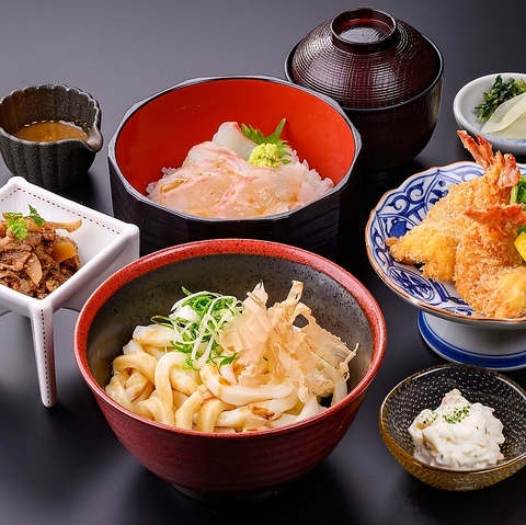 「美味し国三重」の魅力を詰め込んだ御膳です。伊勢名物の伊勢うどん、三重県産真鯛の胡麻たれご飯、開きエビフライ、松阪牛と牛蒡のしぐれ煮、伊勢志摩産あおさの味噌汁山海の恵みをゆっくりとご堪能ください。(表記価格は税込です。)
