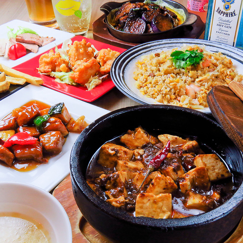棒棒鶏/石鍋麻婆豆腐(中)/黒酢酢豚 or 青椒肉絲/楊州チャーハン/玉子スープ/杏仁豆腐が付いたペアセット。