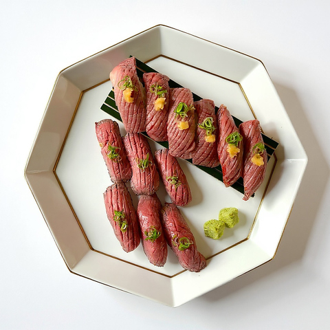 贅沢な近江牛大トロ2貫と和牛モモ2貫の肉寿司盛り合わせ。とろけるような大トロの旨味と、モモのしっかりとした味わいを一度に楽しめる逸品です。特別な日の一品として、ぜひお試しください。
