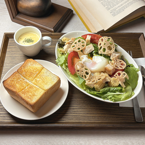 たっぷり野菜にグリルチキン、フライドレンコン、とろーりタマゴをのせたサラダに、スープ、もち粉パンをセットにしたプレートです。ドレッシングは胡麻、シーザーから選べます。+¥300でコーヒーなどドリンクを付けれます。
