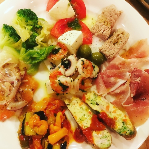 海の幸のマリネ・生ハム・カルパッチョ・モッツァレラのカプレーゼ・野菜オムレツ等々定番が勢ぞろい。色々な味をお楽しみください。