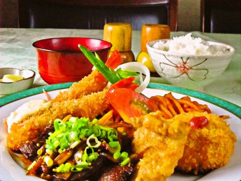 当店人気NO.1。みんな大好き!何を食べてもおいしい【THE洋食】が食べられる一皿です。海老フライ・牛生姜焼き、唐揚げに大人気のカニクリームコロッケ★ごはんやスープ、サラダもついて超お得!!豚ではなく牛肉の生姜焼きに山椒がピリッと効いてご飯がすすみます。