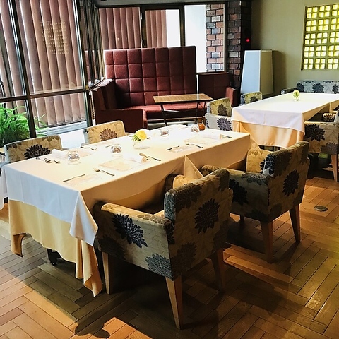 窓から差し込む自然光が優しく室内を照らす、明るく穏やかな雰囲気のテーブル席です。店内各所に生けられた四季折々の花々が、お食事の時間を華やかに彩ります。隣の座席との間隔も十分に確保されており、ゆったりとした時間の流れを感じながら、産地直送の旬食材を使用した美しい一皿を心ゆくまでお楽しみください。