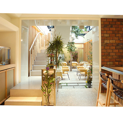 店内は吹き抜け構造を採用しており、1階から2階にかけて驚くほどの開放感が広がります。高い天井と大きな窓から差し込む太陽光が、室内を明るく包み込み、開放的なテラスにいるような気分でお食事を楽しめます。一軒家ならではの贅沢な造りは、特別な日を演出するのに相応しく、心ゆくまでリラックスいただけます。