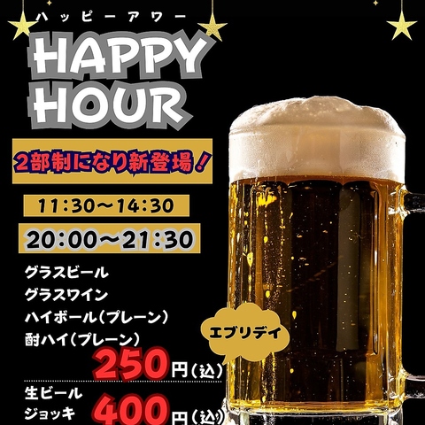 ハッピーアワーが便利な2部制で2次会利用も出来る!貴重な20~21時半!