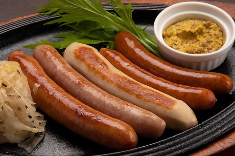 本場ドイツのマイスター監修!バルナバハムのソーセージの5本盛り合わせです。何と言ってもビアホールの定番料理ですね!樽生ビールには絶対に合うこと間違いなし◎肉肉しいソーセージです。