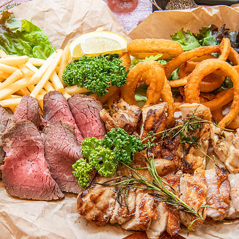 ビーフ・チキン・ポークを豪快に盛り込んだ総重量1kgのインパクトプレート!※ハーフサイズも有り写真以上の迫力でテーブルを埋め尽くすメガ森は、運ばれてきた瞬間に「わぁ…!」と笑顔がこぼれること間違いなし