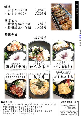 焼鳥や揚げもの、お弁当のテイクアウトも承っております!ぜひご利用ください♪