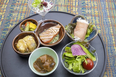 生ハムのオードブル、地場産のサラダ、TSUTSUMUスープ、香の物、古代米のご飯、本日のデザート、珈琲又は紅茶又は柚子茶付き。+550円で本日の前菜付きます。※12/24.25の2日間はご用意できません。