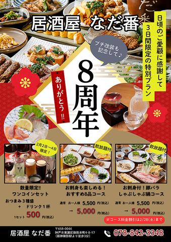 2月で8周年♪2/2(月)~2/4(水)はお得なワンコインセットをご用意!2月限定で飲放題付きコースの割引も