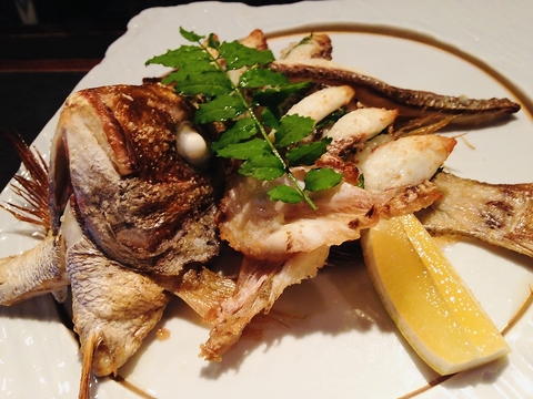魚のあらの下には山椒を利かせたお寿司が隠れている。250℃のオーブンで焼き上げた、ちょっと変わったお寿司。