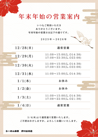 | 定休日 | 無休(1/1と1/2はお休みします) |