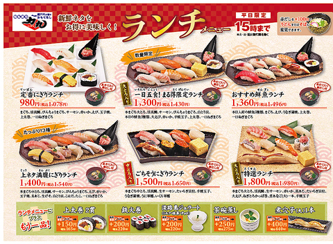 平日11~15時限定!!【1】冬の旬盛りランチ1430円(込)【2】定番にぎりランチ1078円(込)【3】おすすめ鮮魚ランチ1496円(込)【4】ごちそうにぎりランチ1650円(込)【5】一日五食!まる得限定ランチ1430円(込)【6】上ネタ満腹握りランチ1540円(込)【7】特選ランチ1980円(込)