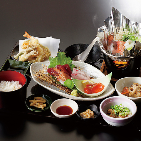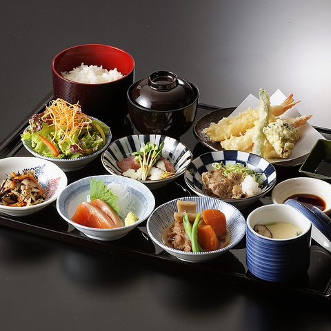◆月替わりの一品 。11月/鶏と大根豆乳煮・12月/チキンスタミナ焼き・1月/豚バラ大根煮(1/2~5は油淋鶏)・2月/鶏ごぼうハンバーグ》◆まぐろお造り◆サラダ◆海老と野菜天ぷら◆季節の小鉢◆白ご飯◆茶碗蒸し◆あおさ味噌汁◆漬物