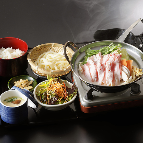 ◆週替り一品≪親子とじ・鶏つくね鍋(うどん付)・陶板味噌バターカツ・つゆだく油淋鶏・豚バラ豆乳鍋(うどん付)≫◆サラダ◆白ご飯◆茶碗蒸し◆あおさ味噌汁◆漬物 ※メインが鍋の場合はあおさ味噌汁は付いていません
