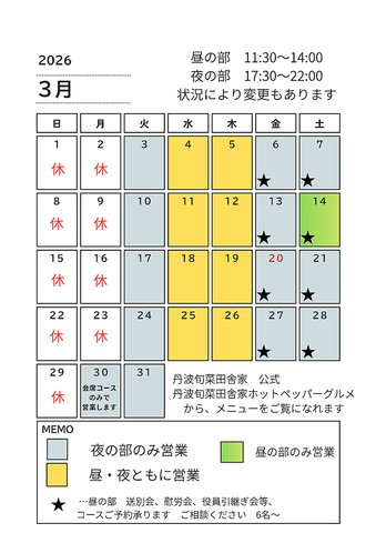 火、金、土、祝日、祝前日: 17:30~22:00 (料理L.O. 21:00 ドリンクL.O. 21:30) 水: 11:30~14:00 17:30~22:00 (料理L.O. 21:00 ドリンクL.O. 21:30) 木: 11:30~14:00 (料理L.O. 13:30 ドリンクL.O. 13:30) 17:30~22:00 (料理L.O. 21:00 ドリンクL.O. 21:30) 昼の部営業を令和7年5月14日(水)から毎週水曜日 木曜日 週2日ですが、再開します。 11:30から14:00 昼の部年内最終営業日は、12/18(木)までとなります |