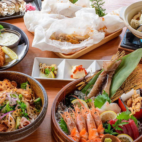 彩り豊かで華やかさのある食材や各地より届くこだわりの魚、肉、野菜を使用した贅沢なコースに仕上がりました。メインの食材に限らず、お造りのお供のワカメやわさび、塩など細部にもこだわりあり!産地や美味しさなどのこだわりが詰まった自慢のコースでステキなご宴会をお楽しみください。