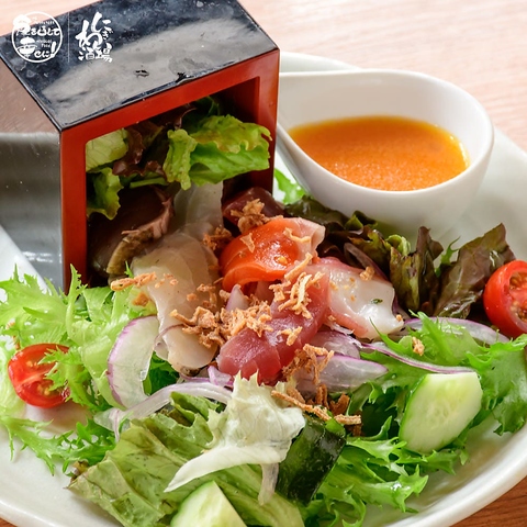 彩り豊かで華やかさのある食材や各地より届くこだわりの魚、肉、野菜を使用した贅沢なコースに仕上がりました。メインの食材に限らず、お造りのお供のワカメやわさび、塩など細部にもこだわりあり!産地や美味しさなどのこだわりが詰まった自慢のコースでステキなご宴会をお楽しみください。