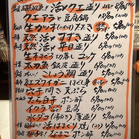 日替わりで10品以上仕入れてのお楽しみ鮮魚!今日のオススメ!愛媛産 クエ!超高級魚の造り旨し♪アラ鍋も是非♪島根産 ハガツオたたき!淡色のあっさりカツオ♪愛媛産 コショウ鯛造り締まってます♪韓国産 穴子開き天婦羅♪長崎産 生本マグロ切落しのユッケ♪