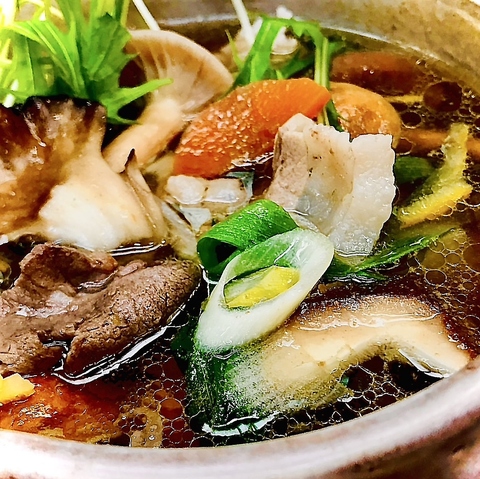 ささくれ一夜茸という、日本で1人しか作ってらっしゃらないめずらしいキノコをスモークしてみたり、衣笠茸の食感を味わってもらったり、キノコワールドが堪能できる一皿!彩りキレイな盛付けに、目にも鮮やかな一品。見ているだけで心もはずむ気持ちに。きのこ料理専門店ならではの一品です!