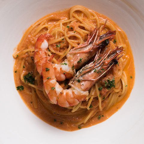 オマール海老からとった出汁の旨味がたっぷりのトマトクリームソースに香ばしくグリルした有頭エビをのせたマザームーンカフェ定番パスタ。