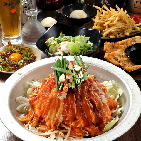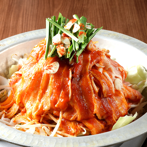 福力名物、山のようなボリューム満点韓国風鉄板鍋の豚鉄鍋☆これがなんと1人前330円税込(税抜価格300円)!正直これだけでも大満足!味もリピーター続出の保証済みです!!※仕入れ価格によりメニュー価格を変更する場合がございます