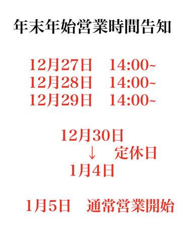 12月27日~12月29日の3日間は14:00オープン!特別営業実施いたします!!!
