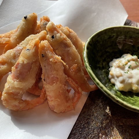 甘エビを贅沢に丸ごとフリットにしました。揚げたての食感と特製ディップをお楽しみ下さい