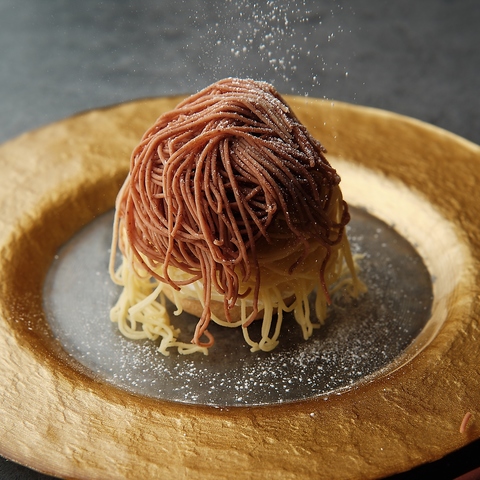 さくさくのパイ生地にアイスをのせ、渋皮のマロンクリームとサツマイモ(なると金時)ペーストをお客様の前で絞り完成させる見ても楽しいモンブラン
