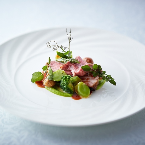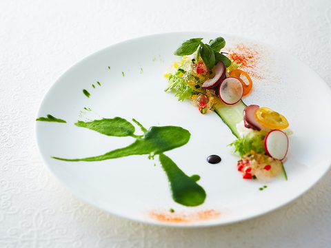和のエッセンスを巧みに取り入れたフレンチは、伝統的なブイヨンやフォンを軸に独創的に仕上げた一皿。旬の食材が奏でる美味しさと奥深いソースの調和に、ここでしか味わえないフランス料理の余韻と満足感を感じていただけます。