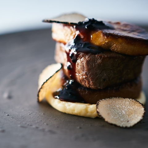 特撰黒毛和牛肉フィレ炭火焼きとフォアグラのロッシーニ 黒トリュフのソース