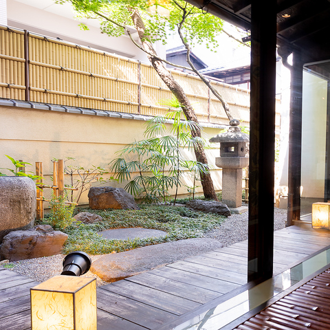 町家の“蔵”を改装した完全個室は大好評!!お庭を横目に町家ならではの細長い廊下を渡った先に有り、天井が高く、土壁や木の温もりを感じて頂ける空間となっております。新年会・同窓会に◎※6名以下の場合、個室料10%頂戴いたします(小学生以上を含む)