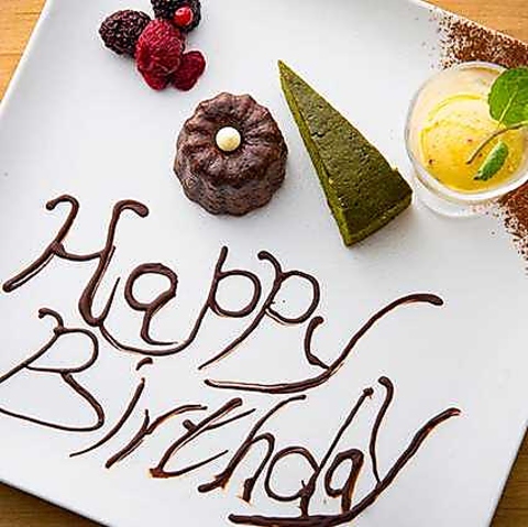 「デザートプレート」は、記念日や歓送迎会など特別な瞬間を演出するために手作りでご用意してます。主役の方へのメッセージをお書きすることで、心のこもったお祝いをお手伝いします。また、バースデーソングとともにデザートをお届けすることも可能。さらにコースをご注文いただいた場合は、デザートプレートを『無料』でご提供しております。