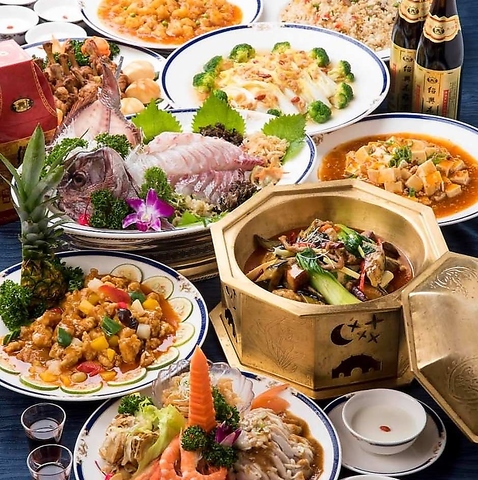 「鯛の姿造り 特製中華ソース」の鮮やかさと、熱々の「牛肉入り四川田舎風銅鍋」が宴を盛り上げる、見た目にも豪華なコースです。定番の人気中華に加え、季節の海鮮料理もご堪能いただけます。大切な方をもてなす接待や、記念日のお祝いなど、特別な一日を華やかに彩るお料理で、心に残るひとときを演出いたします。