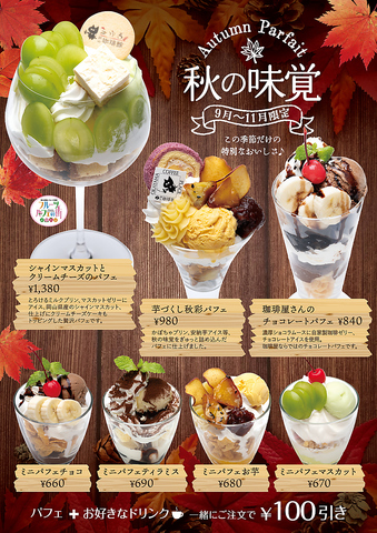 12月~2月限定で楽しめる、冬の特別パフェが登場!黒蜜きな粉や濃厚チョコ、苺とショコラの華やかな組み合わせなど、季節感あふれるラインナップをご用意しました。ミニサイズもあり、気軽に楽しめるのも魅力♪さらにパフェとドリンクを一緒に注文すると100円引き!この冬だけの贅沢なひとときを、ぜひお楽しみください♪