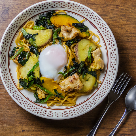 グリルチキン、さつまいも、かぼちゃ、ほうれん草を使用し半熟卵をトッピングしました。
