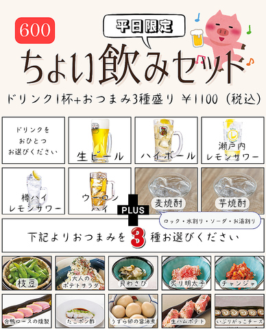 生ビールやレモンサワー、焼酎などの中からドリンク一杯とお好きなおつまみ三種盛りのちょい飲みセット登場