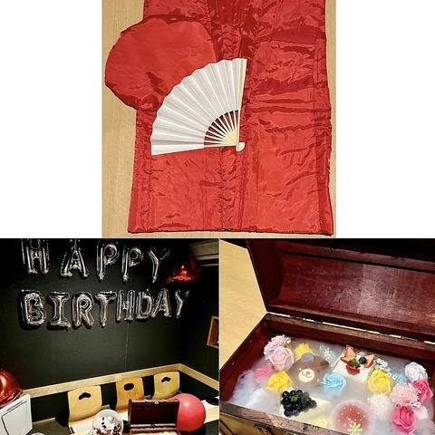 還暦のちゃんちゃんこ無料貸し出しや、宝箱スモークサプライズ、お部屋の飾り付けもお任せください!