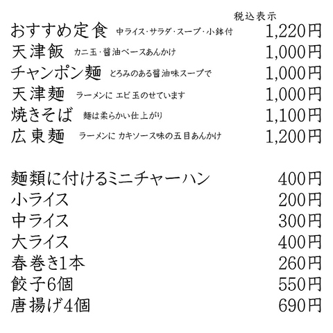 - ※表示価格は税込みです。 お昼は基本ランチメニューと麺飯類のみで営業しております。