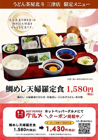 三津店限定!鯛めし天婦羅定食1580円をホットペッパーグルメクーポンご利用で1430円に割引!