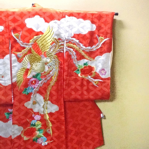 座敷の床の間には昭和初期の子供着物を掛け軸代わりに。別名子供打ち掛けと呼ばれる程の見事な刺繍が美しい。