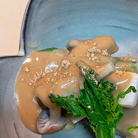 胡麻豆腐、菜の花、大和芋、キノコ辛子胡麻酢和え